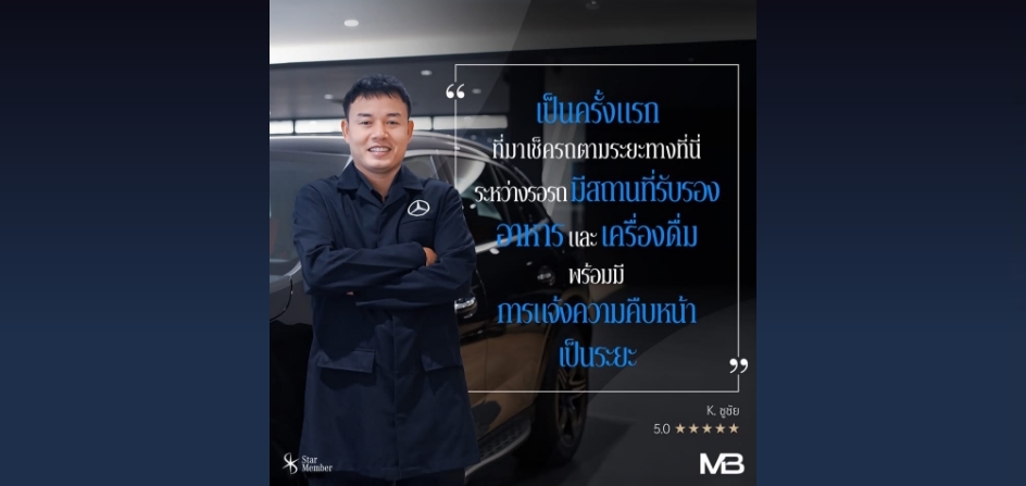 "เป็นครั้งแรกที่มาเช็กรถตามระยะทางที่นี่ แม้ว่าจะซื้อ Mercedes-Benz ที่นี่มา 3 คันแล้ว เนื่องจากต้องรอรับรถกลับ ประทับใจในช่วงที่รอรับรถ มีสถานที่รับรอง อาหารเครื่องดื่มและของว่าง และมีการแจ้งให้ทราบเป็นระยะครับ" K. ชูชัย