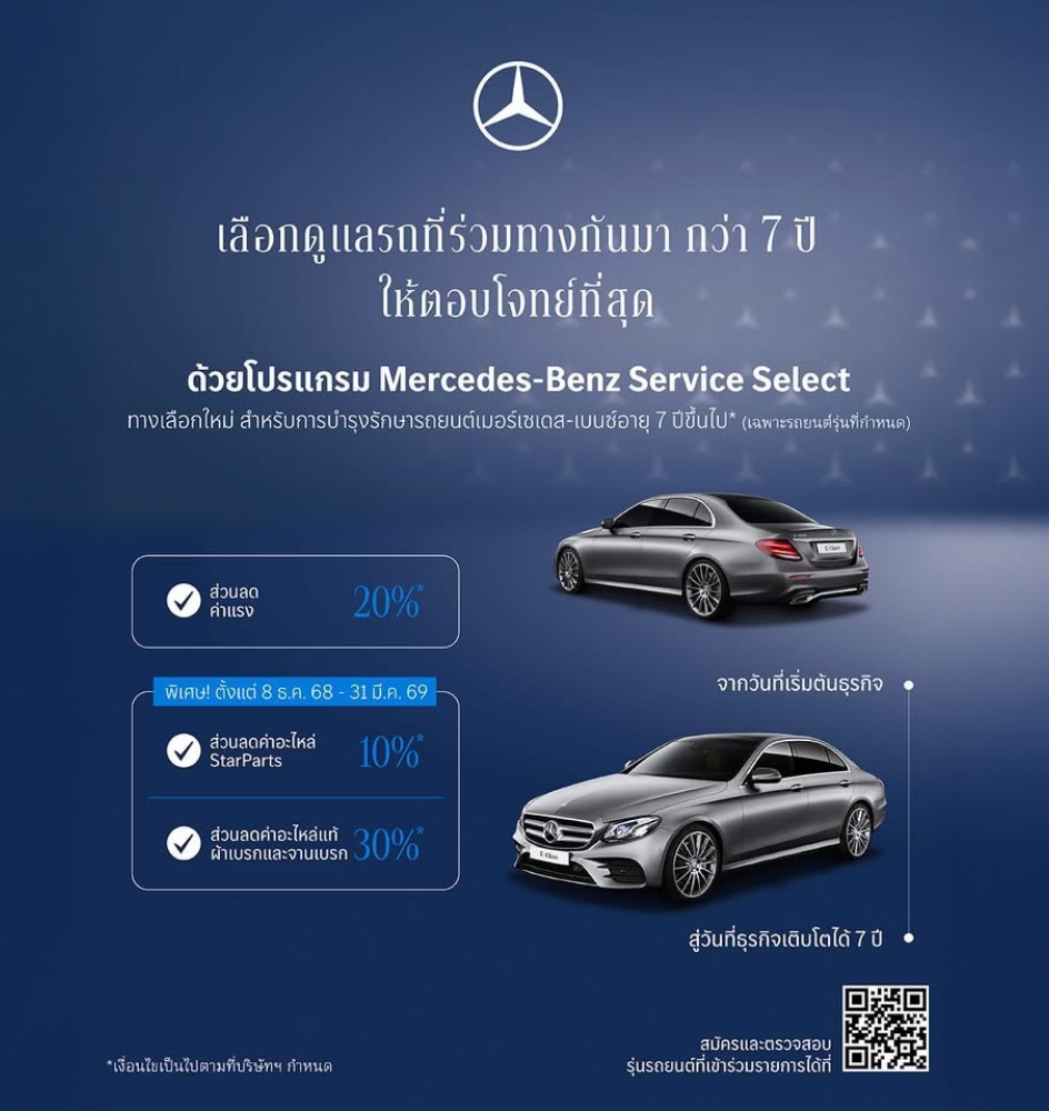 ด้วยโปรแกรม Service Select ทางเลือกใหม่ที่ออกแบบมาเพื่อการบำรุงรักษารถยนต์เมอร์เซเดส-เบนซ์อายุ 7 ปีขึ้นไป* (เฉพาะรุ่นที่กำหนด)